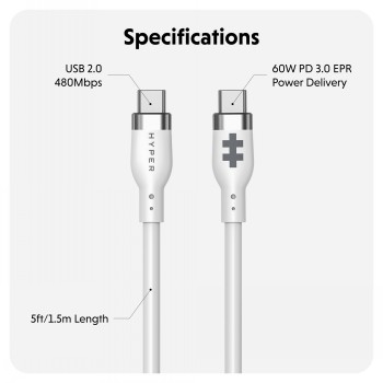 HYPER 1.5M USB-C CHARGING CABLE, 60W PD3.0, SILICONE, WHITE