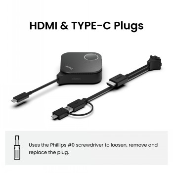 - Yhteensopiva suoraan BenQ InstaShow WDC15 -vastaanottimen kanssa – "plug and play", ei vaadi sovelluksia, ajureita tai verkkoyhteyttä